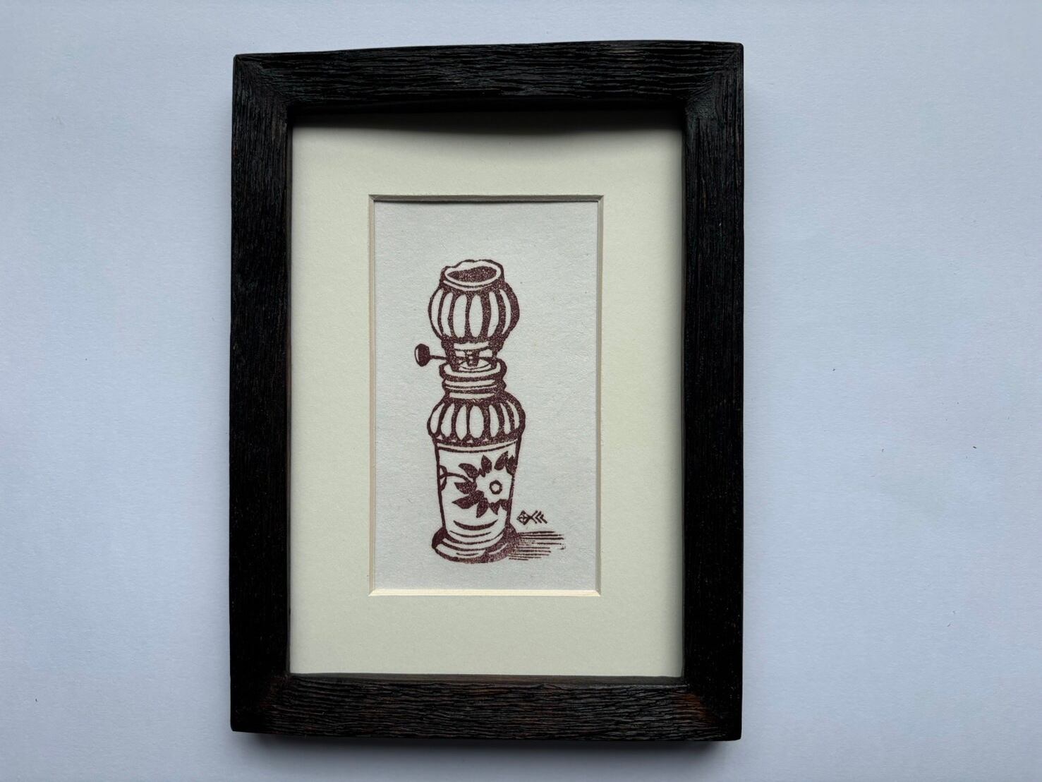 陶製のランプをモチーフに描かれた、小さな版画作品です。