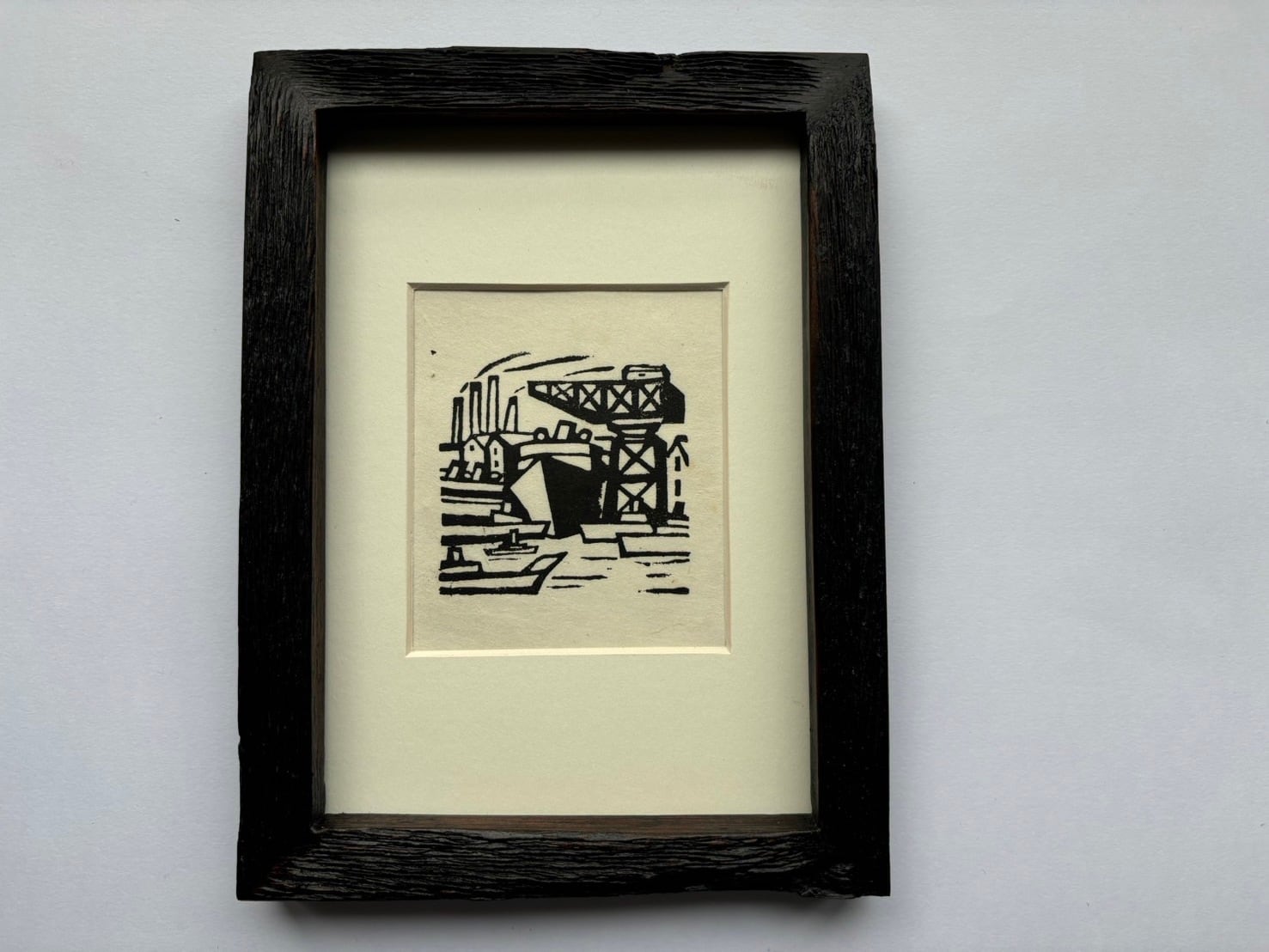 長崎港の風景を象徴するジャイアントカンチレバークレーンを描いた木版画作品です。