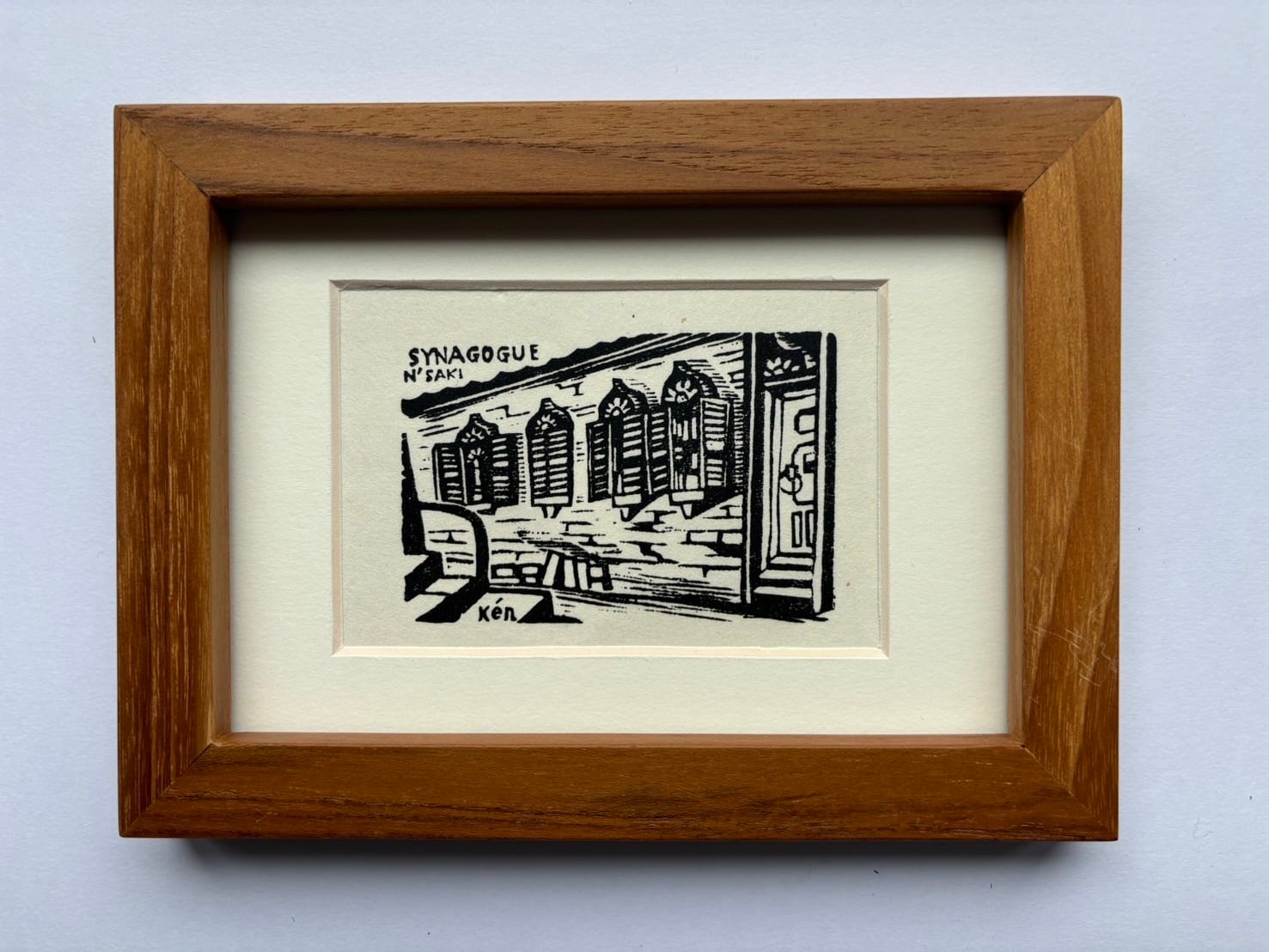長崎の異国文化を象徴する建築のひとつ、猶太(ユダヤ)教会・シナゴーグを描いた木版画作品です。特徴的な外観や建物の輪郭を簡潔で力強い線によって表現し、静かな存在感を画面の中にとどめています。