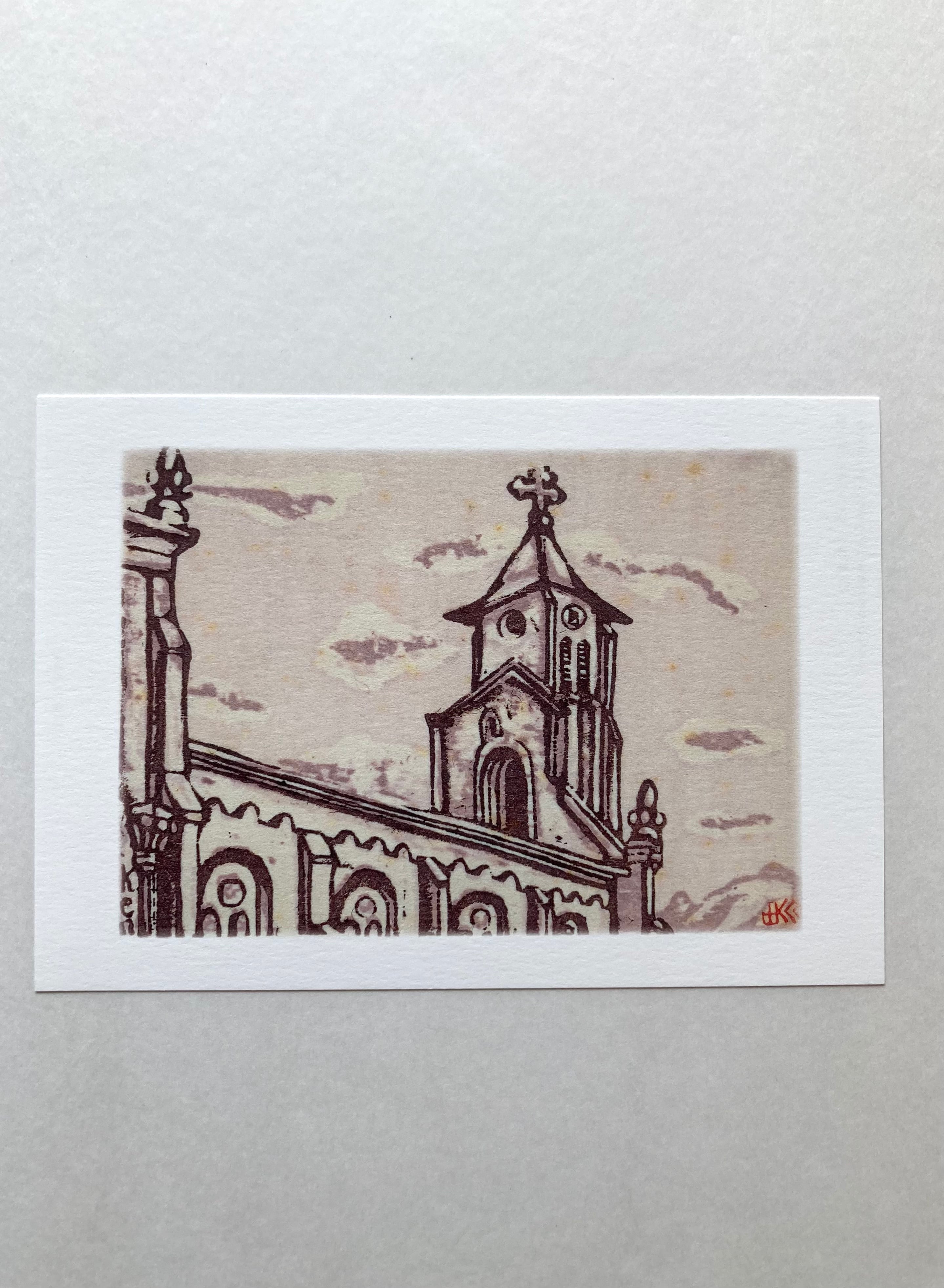 田川憲はこの教会の姿を、戦後の街並みや光の陰影を意識してハガキサイズで表現しました。