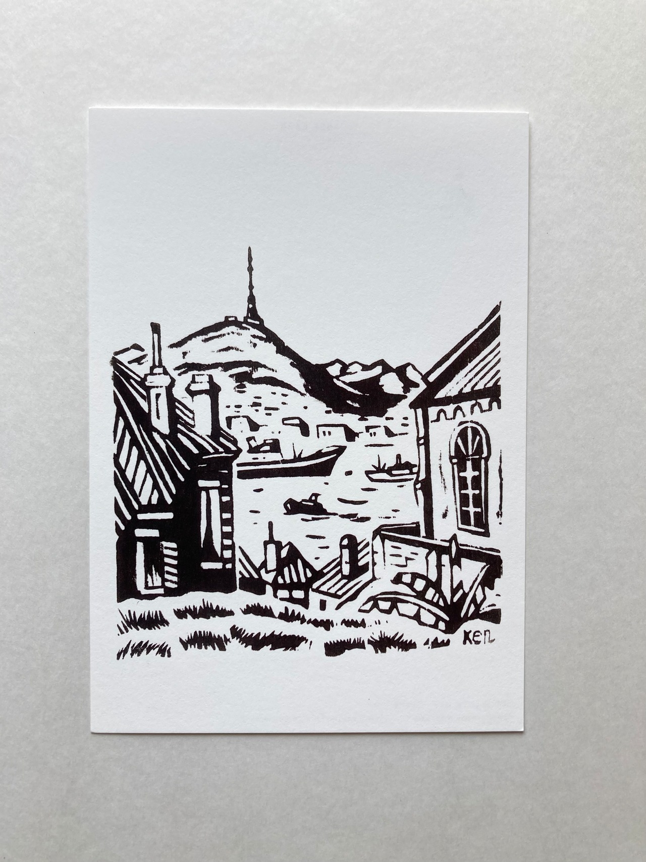 「居留地と海」 — 長崎居留地から望む稲佐山と海の風景を描いた田川憲のハガキサイズ作品