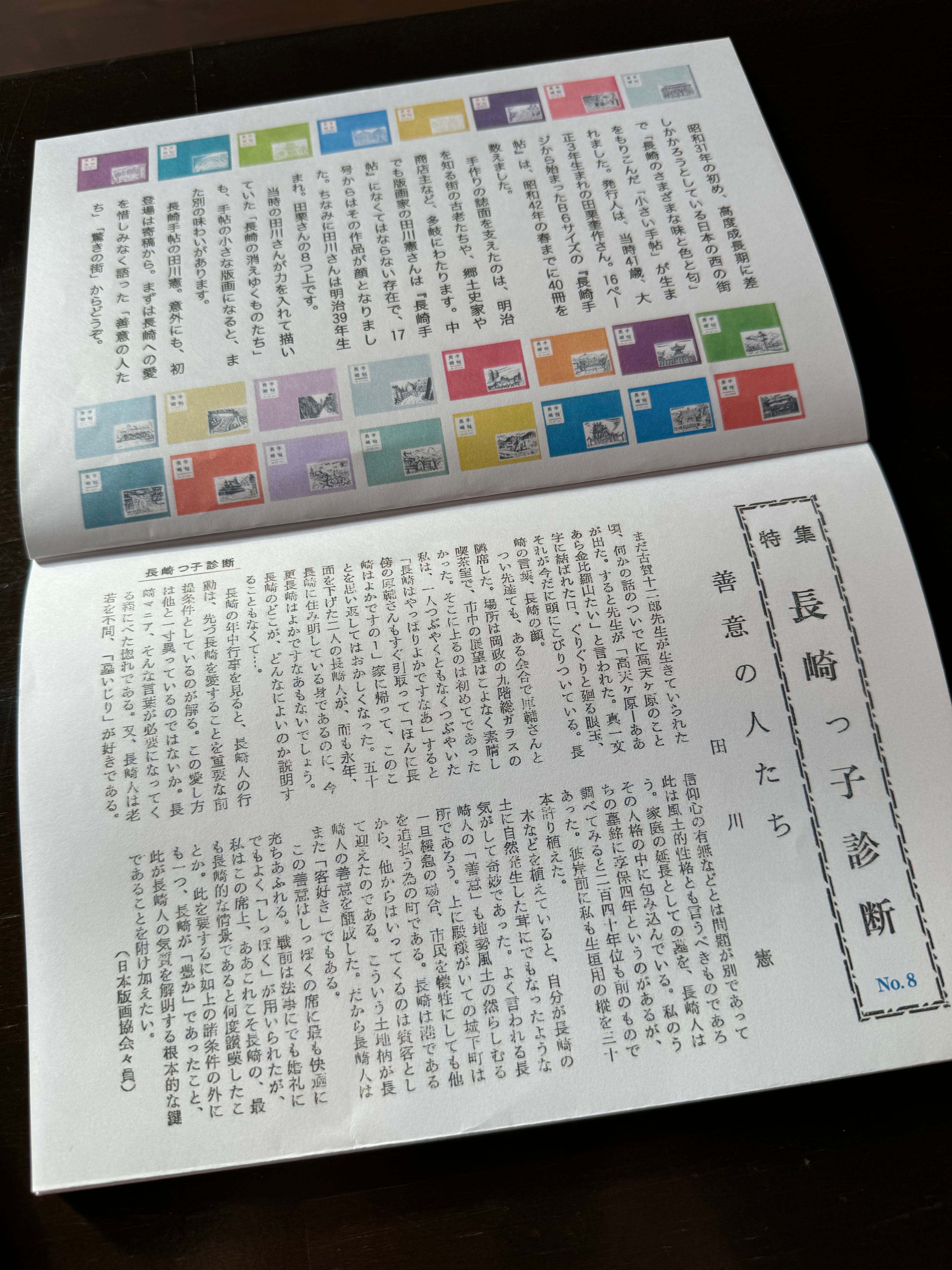 1956-1968年の間に40号まで発行された、「長崎手帖」。発行人は田栗奎作さん。おひとりで取材・執筆・編集・営業・販売をされて続けられた冊子です。田川憲は表紙の小さな版画や寄稿などを寄せていました。